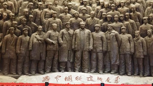 在西柏坡纪念馆,同学们在讲解员老师的介绍下,参观了12个展室。纪念馆的序厅正中央是一面铜雕,铜雕的主体是毛泽东率领的七届33位中央委员和44位中央候补委员,背景是西柏坡中共中央旧址和雄伟绵延的太行山,东西两边浮雕刻画的是中国共产党发展历程中几个标志性纪念地——上海,井冈山,遵义,延安。寓意着中国共产党领导下的中国革命经过28年艰苦卓绝的斗争终于从西柏坡走向了光明的未来。展厅介绍了有关西柏坡所在的平山县的有利条件、中国共产党全国土地会议、领导解放区的土地改革运动和整党运动、晋察冀野战军、华北财经办事、九月会议、辽沈,淮海,平津三大战役等等历史内容。从整体上看,展览以平山人民光辉的抗日斗争为铺垫,以解放战争后期中共中央在西柏坡时期的活动为主线,运用了大量的文物、照片和历史资料,辅之于绘画、雕塑、景观、幻影成像、半景画等高科技手段,重点介绍了中央工委、中共中央和毛泽东等老一辈革命家在西柏坡的伟大革命实践,同时将建国后社会各界参观瞻仰西柏坡和在这里举行的重大活动等情况进行展示。同学们被老一辈革命家的革命精神打动和鼓舞,并表示一定从自身做起,将老一辈人的红色精神传承下去。