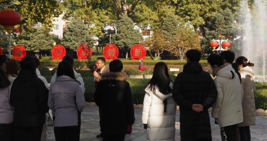 在正定县县政府前,同学们聆听了河北正定师范高等专科学校马克思主义学院辛延英院长讲解习近平总书记在县委上班的往事。辛延英院长为同学们讲述了习近平总书记提出的“内用、外招、上请、下挖、近补、远育”的引才育才用才“十二字真经”,不拘一格选拔人才,为当时正定的发展注入了生机和活力。之后辛院长巧妙地借用古槐的树叶为引子,生动形象地给同学们讲解了习近平新时代中国特色社会主义思想的内涵,同学们都深受启发。辛院长讲到,习近平总书记在正定工作期间,倾注了极大心血和深厚情感,为正定发展奠定了坚实基础、做出了历史性贡献,留下了弥足珍贵的思想财富、精神财富和实践成果。从这次教学中,同学们更加深刻的领会到了以习近平总书记为代表的共产党人不忘初心牢记使命的精神,习总书记扎根人民为了人民的作风也成为了同学们的力量之源。