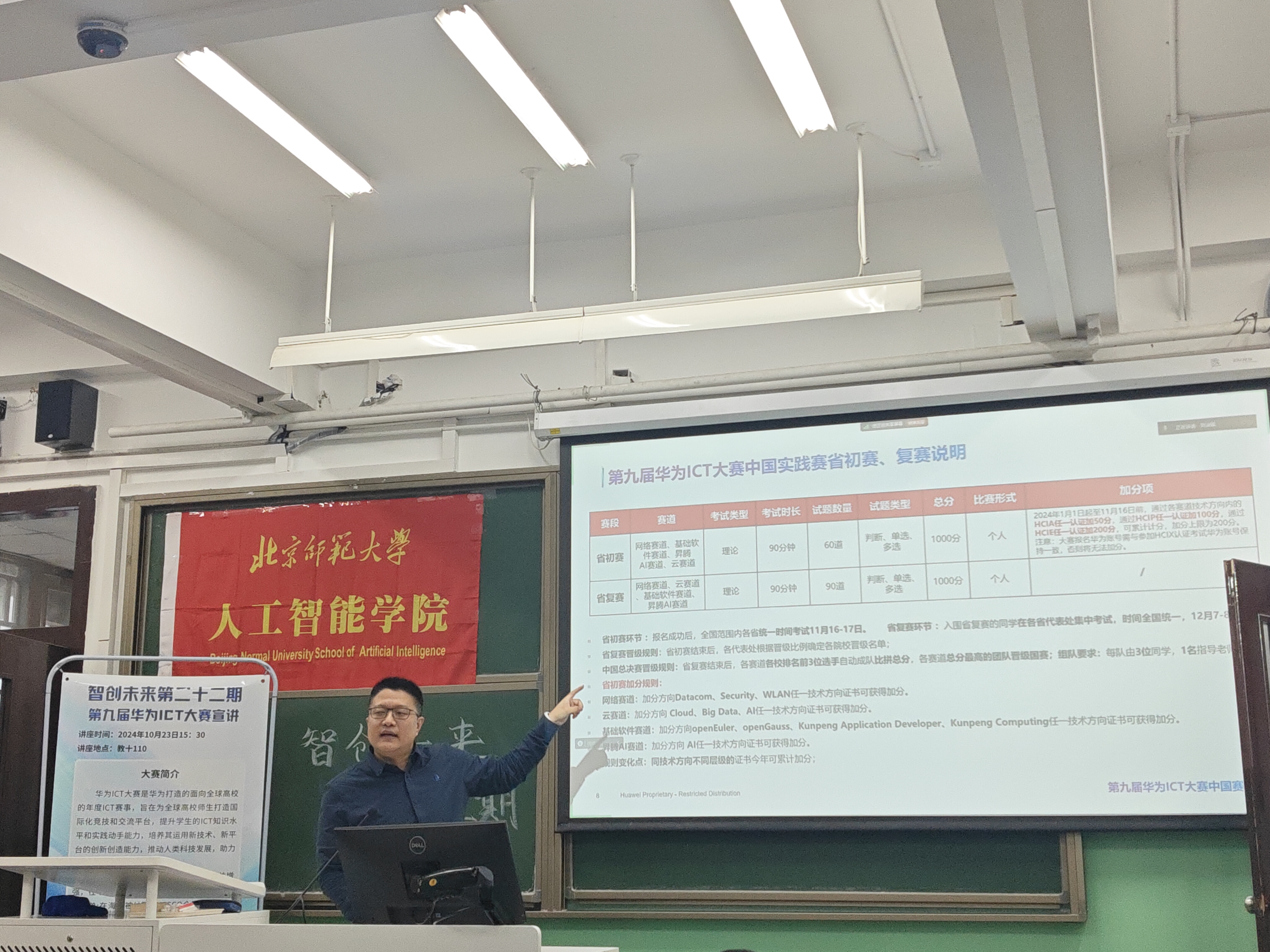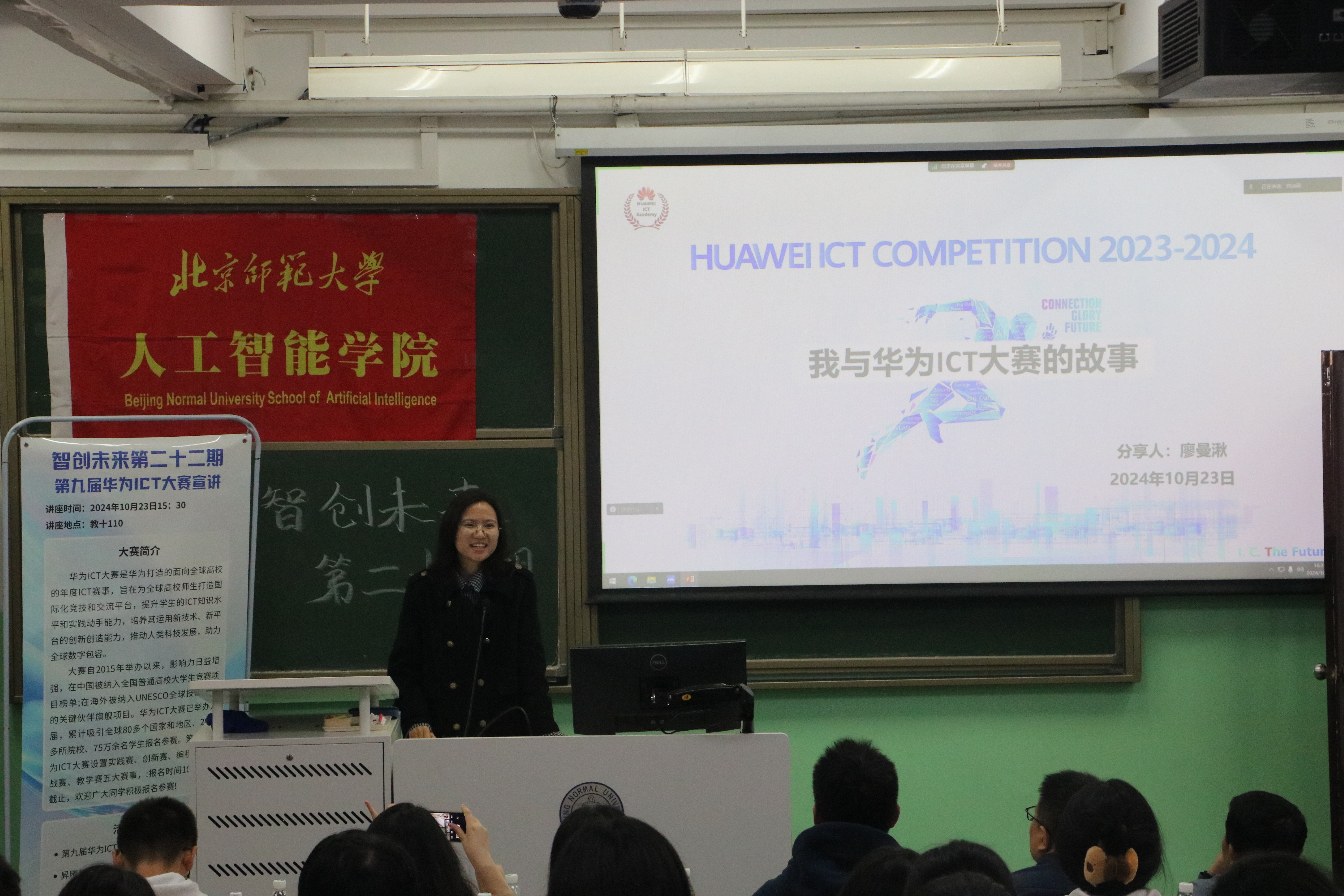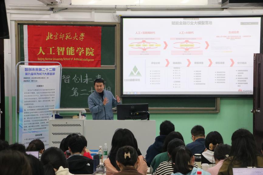 为增强各位同学对于华为ICT竞赛的认识,积极鼓励大家参与ICT竞赛,91制片厂 于2024年10月23日下午15:30在教十110教室举行智创未来系列活动第二十二期——第九届华为ICT大赛路演91制片厂 专场。华为北京人才发展生态经理崔宇、讯方技术京西智谷基地运营总监王福刚,讯方技术京西智谷基地商务总监赵娜、华为昇腾专家王瑞平、智慧云校人工智能专家讲师黄鑫、讯方技术京西智谷基地人工智能方案专家王雨彤、京西智谷基地人工智能方案专家舒文慧、华为ICT大赛创新赛获奖者廖曼湫,91制片厂 副院长计卫星、91制片厂 教师邓擎琼以及学院70余名同学参与本次活动。