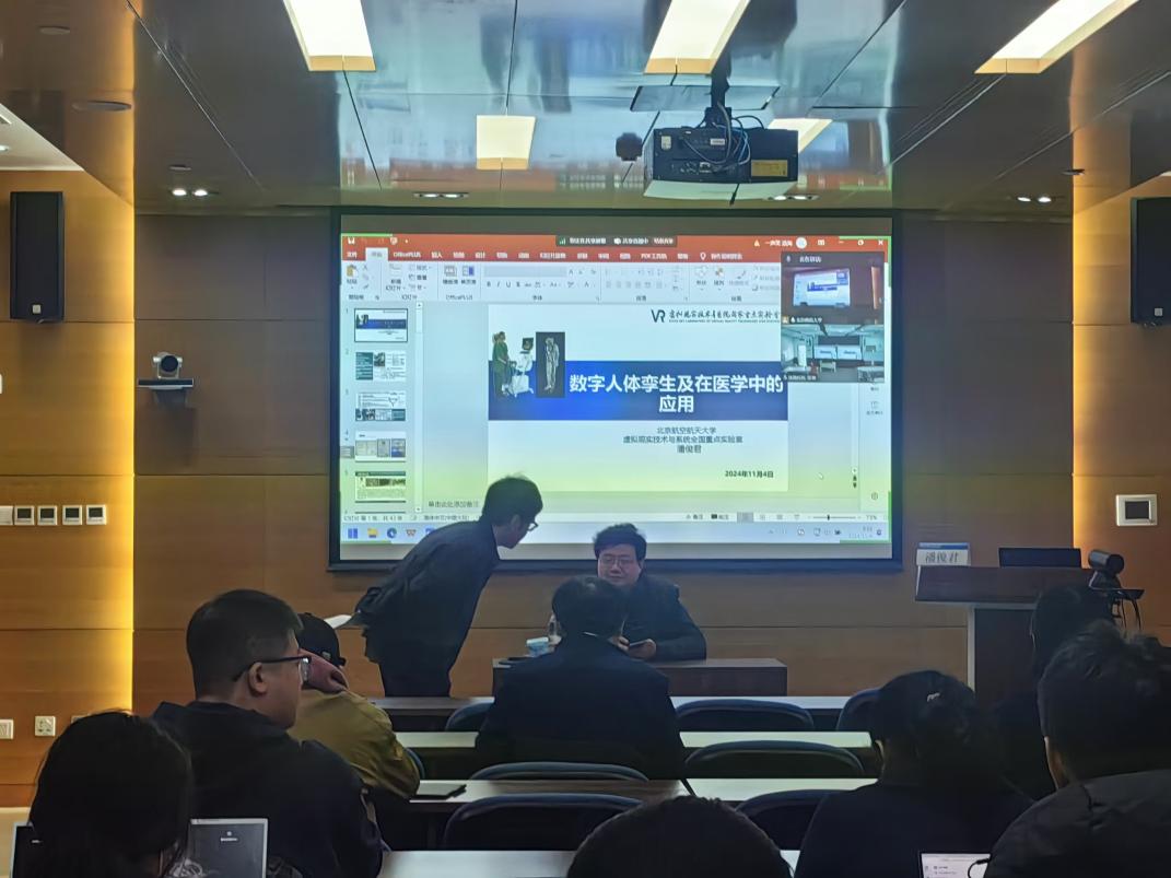 2024年11月4日, 91制片厂 京师智能讲堂第二十期在海淀校园京师讲堂第三报告厅成功举办。本次讲座特邀国家万人计划青年拔尖人才,中国虚拟现实产业联盟虚拟医疗专委会秘书长,北京航空航天大学虚拟现实技术与系统全国重点实验室潘俊君老师以“数字人体孪生及在医学中的应用”为主题作报告。全校师生积极参与本次活动。