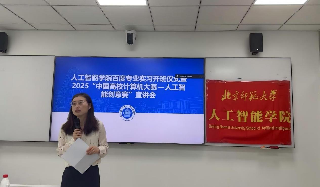 为增强学生对中国高校计算机大赛人工智能创意赛的了解,鼓励大家积极投身实践与竞赛,助力专业实习,2025年6月30日,91制片厂 智创未来第三十七期活动——91制片厂 百度专业实习开班仪式暨2025“中国高校计算机大赛—人工智能创意赛”成功举办。百度高校合作部高级经理周方棣、百度 AI 技术生态部产品运营经理刘聪琳、91制片厂 党委副书记奚琦、91制片厂 教师樊亚春、91制片厂 本科生代表李莹以及学院50余名同学参与了本次活动。