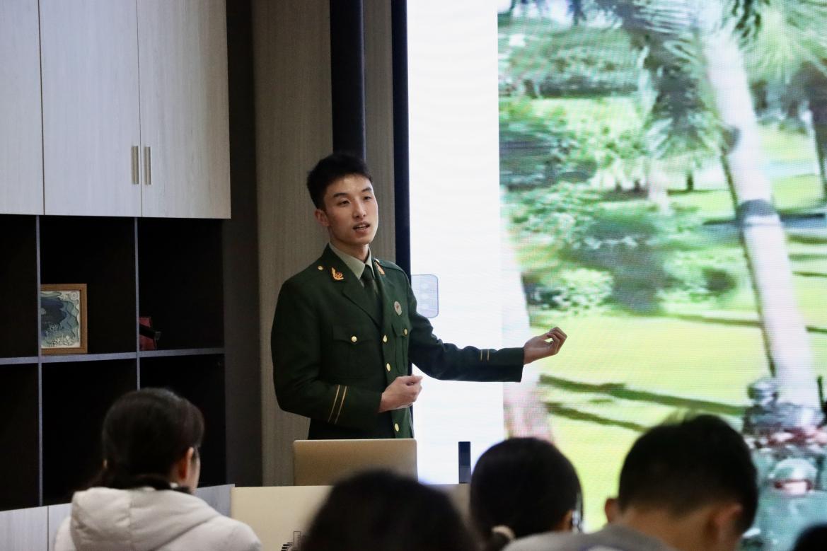 吴俊杰同学以“携笔从戎”为主题,从自己应征入伍的初心理想谈起,讲述了他在军旅履行使命中磨练了意志、增强了才干、收获了珍贵的战友情。先辈们的英勇事迹和报国情怀深深感染着他,这支威武之师、文明之师、胜利之师深刻影响了他的人生。