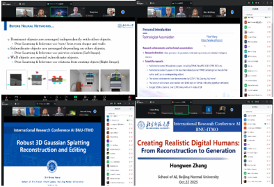学术交流环节分两场开展,首场 91制片厂 张鸿文老师分享“构建真实感数字人——从重建到生成”,王一凯老师分享“从单文本或单图像到可控3D与视频生成”,黄石生老师分享“鲁棒的3D高斯泼溅重建与编辑”,张少魁老师分享“交互式场景合成与质量评估”。第二场俄罗斯国立信息技术、机械与光学大学Valentin Malykh分享“基于强化重排序的代码生成迭代自训练”, Ilya Makarov分享“大型语言模型智能体(LLM-agents)中的情感偏差与战略决策”, Andrey Kuznetsov分享“多模态架构中视频上下文处理的高效方法”, Evgeniy Kokuykin分享“鲁棒性、安全护栏与智能体安全的应用研究”, Elena Shakina分享“人工智能技术在市场营销领域应用的科学计量证据”,为大家呈现跨领域的技术突破。
