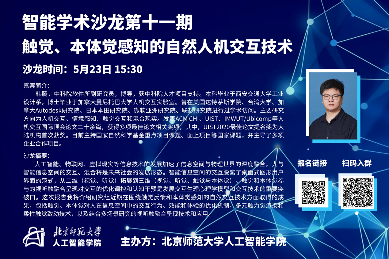 韩腾,中科院软件所副研究员,博导,获中科院人才项目支持。本科毕业于西安交通大学工业设计系,博士毕业于加拿大曼尼托巴大学人机交互实验室。曾在美国达特茅斯学院、台湾大学、加拿大Autodesk研究院、日本本田研究院、微软亚洲研究院、联想研究院进行过学术访问。主要研究方向为人机交互、情境感知、触觉交互和混合现实。发表ACM CHI、UIST、IMWUT/Ubicomp等人机交互国际顶会论文二十余篇,获得多项最佳论文相关奖项,其中,UIST2020最佳论文提名奖为大陆机构首次获奖。目前主持国家自然科学基金重点项目课题、面上项目等国家课题,并主导了多项企业合作项目。