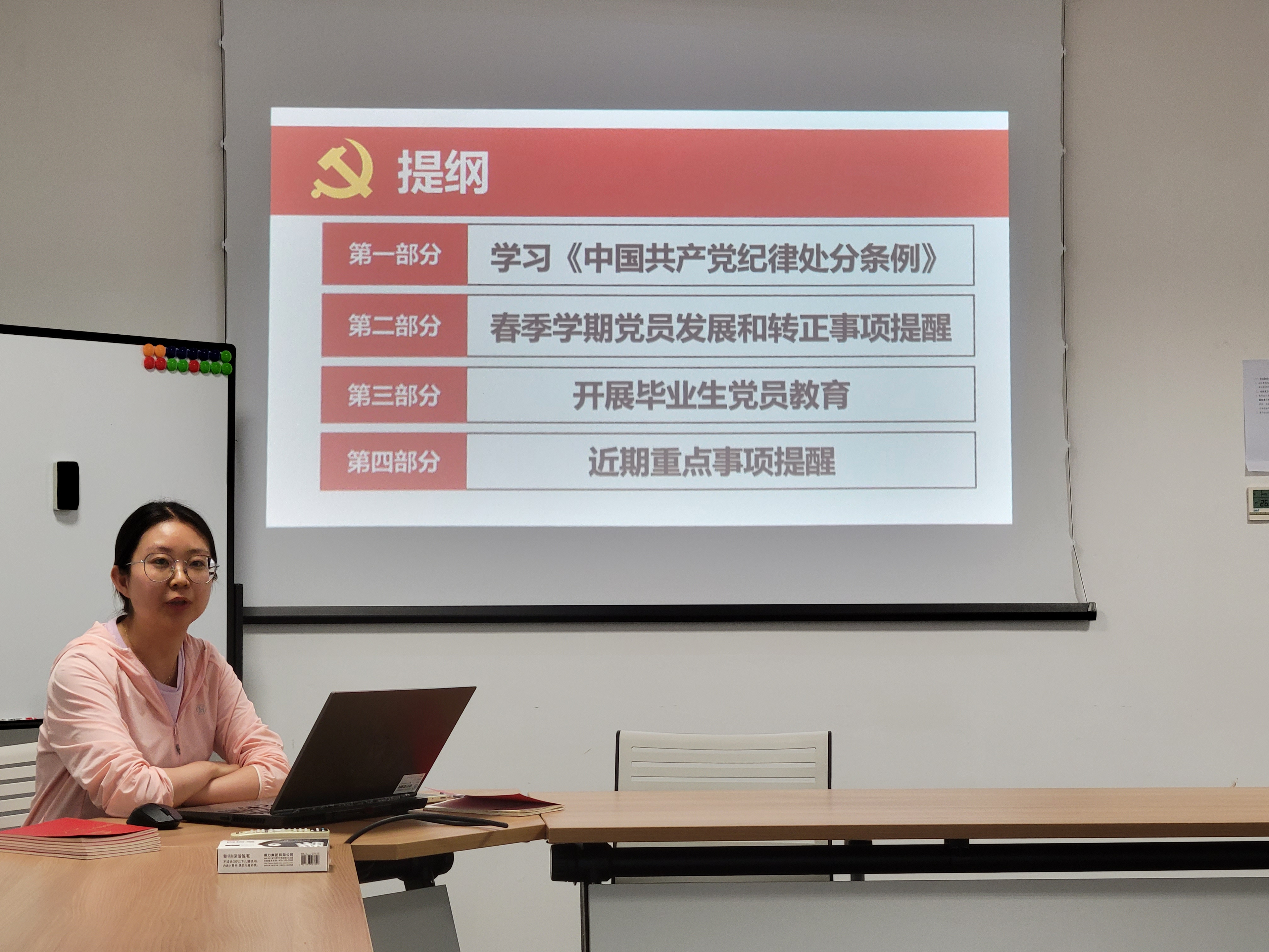 会议首先强调各支部要切实贯彻落实党纪学习教育的目标和要求,依照支部计划高效有序地开展系列学研实践活动,原原本本、逐章逐句学习《中国共产党纪律处分条例》。会议上,石红薇老师带领全体支部书记集中学习《中国共产党纪律处分条例》,深入探讨学生党员应遵守的纪律要求、违纪行为的认定标准以及相应的处理程序。引导学生党员正确认识党纪纪律、严格遵守党规党纪,不断提高政治理论水平和党性修养。会议要求各支部书记要带头上党课,纪检委员担起担子,引领支部全体党员共同学习。